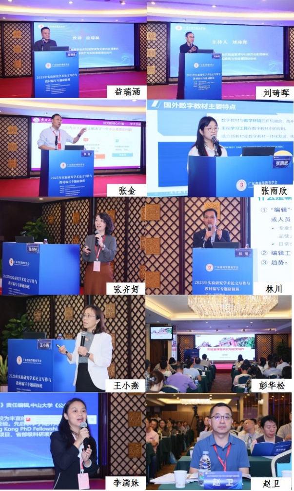 研修班特邀实验教学、期刊编辑、教材建设等领域权威专家作专题报告,他们分别是:南开大学实验室设备处副处长、《实验室科学》常务副主编张金;国家虚拟仿真实验教学课程共享平台(实验空间)运营主管张雨欣;《暨南大学学报(自然科学与医学版)》副主编、暨南大学生命科学技术学院教授张齐好;华南理工大学学报(社会科学版)》责任编辑、中山大学《公共行政评论》杂志原资深编辑林川;广东省高教学会新商科实验教学专委会理事长、广东金融学院金融虚拟仿真国家级实验教学示范中心主任王小燕;《实验室研究与探索》期刊常务副主编、上海交通大学实验室安全与环保中心副主任彭华松。各位专家分别从不同角度带来了精彩的报告,内容涵盖实验室课题研究、期刊论文写作投稿、数字教材编写应用等多个方面,为学员们呈现了一场学术盛宴。南方医科大学公共卫生学院教授、广东省热带病研究重点实验室主任赵卫,暨南大学药学院正高级实验师、公共科研平台副主任李满妹分别主持上午和下午的培训班。